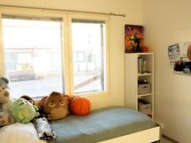 - Talon julkisivupuolelta sekä huoneiston yhdestä makuuhuoneesta, näkymä taloyhtiön parkkialueelle, vastapäisen yhtiöön kuuluvien luhtitalojen takapihojen suuntaan. Ilmansuunta pohjoinen.
