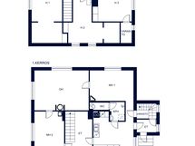 1. kerros: Olohuone, 2 mh, keittiö, eteinen, pesutila, wc, eteinen, kuisti, varasto.