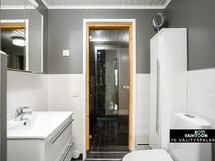- Pesutilojen varusteet: WC-istuin, suihku, suihkuseinä, pesukone, kuivausrumpu, lattialämmitys, peilikaappi ja kylpyhuonekaapisto ja asennettuja varusteita. Pesutilojen kuvaus: Pesutilat ja sauna remontoitu v. 2013. Erillisten WC:n lukumäärä: 2. Erillisen WC:n varusteet: WC-istuin, pesuallas ja pyyhekuivain. Erillisen WC:n kuvaus: Alakerran lattia laatta ja seinät osaksi kaakeloitu/maalattu. Alakerran WC:ssä kph-kaapisto. Yläkerran WC: muovimatto ja seinät paneloitu.