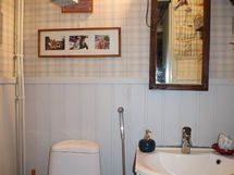 Pesutilojen kuvaus: Tilava kylpyhuone on remontoitu 2003. Vesikiertoinen lattialämmitys. Pesukoneliitäntä kellarissa.