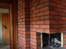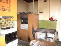 Tilava keittiö, jossa puuhella ja leivinuuni.