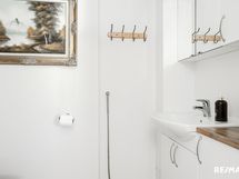 - Pesutilojen kuvaus: Keittiöstä käynti saunaosastolle, jossa laatoitettu kylpyhuone, lattialämmitys. Lämminvesivaraajalle oma erillinen tila. Lisäksi kylpyhuoneeseen mennessä vaatehuone. Erillisten WC:n lukumäärä: 1. Erillisen WC:n kuvaus: Erillinen wc eteistilassa, wc-istuin, lavuaari, käsisuihku.