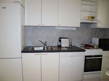 Keittiön varusteet: Jääkaappipakastin, liesi, astianpesukone ja liesituuletin. Keittiökaapistot uusittu 2025.