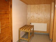 Pesutilojen kuvaus: Kellarikerroksessa laatoitettu pesuhuone ja sauna. Kellarissa myös erillinen wc.