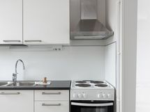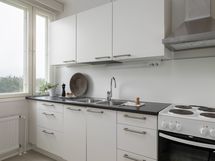Liesi: keraaminen. Työtasot: laminaatti. Kylmäsäilytys: jääkaappi/pakastin. Varustus: liesituuletin, kiinteät valaisimet. Vaaleat, modernit kaapistot.