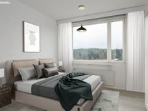 Makuuhuone on hyvänkokoinen ja kiinteät kaapistot tuovat mukavasti säilytystilaa. Lisäksi asunnosta löytyy vaatehuone, jossa on sekä hylly- että rekkitilaa runsaasti.
