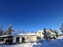 Erillinen 70m2 autotalli, jossa lämmin varasto 15m2 + ulkokatos jossa säilytetty peräkärryä. Tallissa on kätevä sähköinen nosto-ovi.
