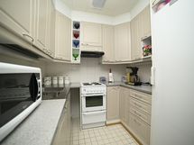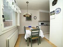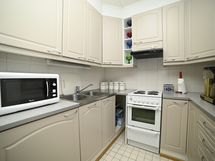 - Keittiön varusteet: Jääkaappi, uuni, liesituuletin ja liesi. Liesi: Valurautaliesi. Työtason materiaali: Laminaatti.
