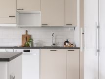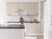 Tyylikkäässä ja avarassa keittiössä on Topi-keittiön laadukkaat kalusteet. Avokeittiössä voit seurustella vieraidesi kanssa samalla ruokaa laittaen. Tämän kodin keittiöön on suunniteltu kauniin hiekan sävyiset ovet, jotka yhdistyvät särmikkäisiin mustiin vetimiin ja eläväiseen marmoritasoon.