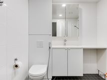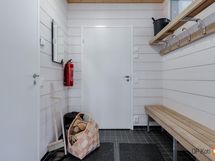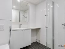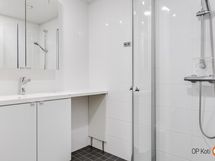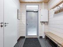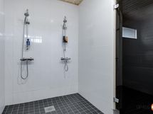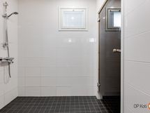 - Kylpyhuone, suihku, suihkuseinä kaksi kääntyvää suihkuseinää, peilikaappi, allaskaappi, pesukoneliitäntä kh:ssa, lattialämmitys, kiinteät valaisimet.
