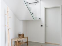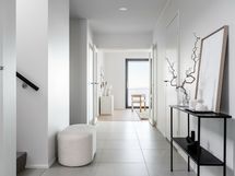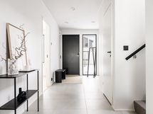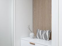 Sisustussuunnittelija Sari Niemitalo on valinnut kotiin arvokkuutta luovia materiaaleja, kuten laadukkaan kovetetun puulattian sekä näyttävän ja kodin huoneakustiikkaa parantavan rimapaneeliseinän. Kodin sävymaailma on haettu harmoniseksi, yhtenäiseksi ja luonnonmukaiseksi kokonaisuudeksi, joka on saanut inspiraationsa upeasta merellisestä ympäristöstä.