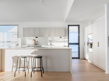 Tilavassa avokeittiössä on iso saareke ja laadukkaat, integroidut kodinkoneet. Tyylikkään keittiön viimeistelee saarekkeen keittotasoon upotettu liesituuletin. Avokeittiössä voit laittaa ruokaa samalla vieraidesi kanssa seurustellen.