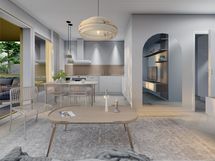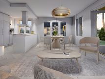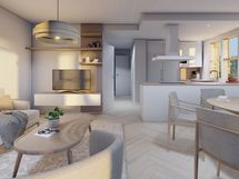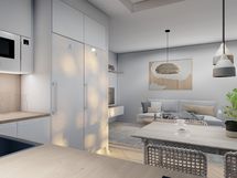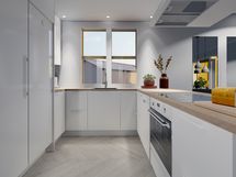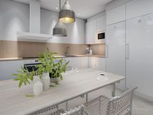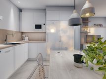 - Liesi: integroitu, induktio, erillisuuni. Työtasot: laminaatti. Kylmäsäilytys: jääkaappi, pakastin. Varustus: liesituuletin, mikroaaltouuni, astianpesukone. Keittiö avautuu avarana tilana olohuoneeseen tehden tilasta tosi avoimen ja valoisan. Seinät on maalattu maalarinvalkoisella, sävy G497. Valkoiset Topi-keittiöiden (HR4) kalusteet ja kalusteisiin integroituinduktioliesi ja uuni ovat tyylikkäät. Jääkaappi- ja pakastin ovat joko rosteriset tai valkoiset. Keittiössä on hyvin säilytys- ja työskentelytilaa. Keittiön välitilassa on välitilalaminaatti.