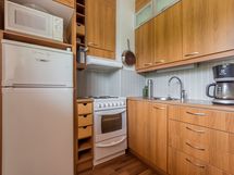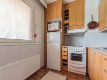 - Toimiva keittonurkkaus, jossa 2000-luvun puolella uusitut kaapistot runkoineen. Jääkaappipakastin, liesi ja liesituuletin. Tila pienelle ruokapöydälle.