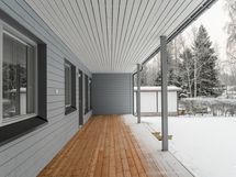 Katto: lämpökäsitelty haapapaneeli. Erillisen WC:n kuvaus: Kalusteet Topi-kalustaja Satiini