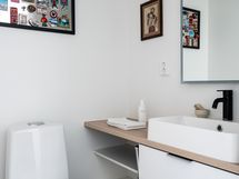 Damixa hanat, sadesuihku. Varustus: suihkuseinä, pesukoneliitäntä, lattialämmitys, wc-istuin, suihku, peili, kiinteät valaisimet, kylpyhuonekaapisto.