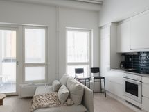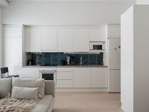 Liesi: integroitu, erillisuuni. Kylmäsäilytys: jääkaappi/pakastin. Varustus: liesituuletin, mikroaaltouuni, astianpesukone.