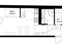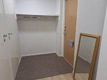 Tilava yksiö erillisellä keittiösyvennyksellä ja vaatehuoneella / työtilalla. Spacious studio apartment with a separate kitchen recess and a walk-in closet / workspace.