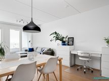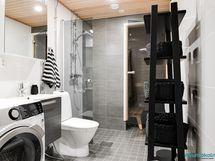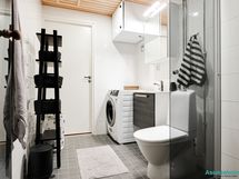 - Pesutilojen kuvaus: Varustus: lattialämmitys, peilikaappi, allaskaappi, pesukoneliitäntä, suihku, suihkuseinä, wc-istuin.