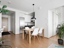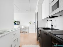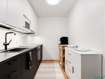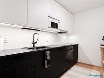 - Varustus: astianpesukone (integroitu), induktioliesi, erillisuuni, mikroaaltouuni (integroitu), jääkaappi/pakastin, liesituuletin. Työtasot laminaattia. Puustellin keittiö.