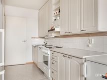 - Jääkaappipakastin, sähköliesi, liesituuletin, astianpesukone, kaapistot. Keittiön kaapistoissa valkeat pinnoitetut ovet, kaapistojen rungot alkuperäiset.
