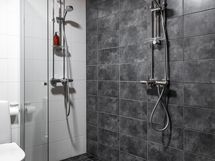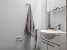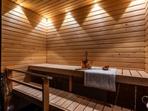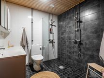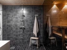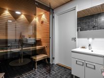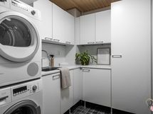 Tämän kodin todellinen harvinaisuus on oma erillinen kodinhoitohuone, joka tekee arjen pyörittämisestä helppoa ja näin kylpytilat pysyvät arjen askareista siisteinä. Kodinhoitohuoneessa on tilaa niin pyykkien kuivatukselle kuin kodinkoneiden sijoittamisellekin. Kodinhoitohuoneen jälkeen avautuu kylpyhuone, joka tarjoaa tilan hemmotteluun: kaksi suihkua sekä lasiseinällä tilasta erotettu suuri sauna, jonka lauteilla voi vaikka pötkötellä. Kylpyhuoneen yhteydessä on myös kodin toinen wc-istuin.