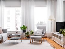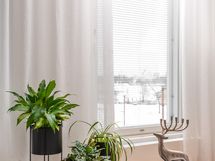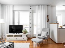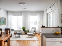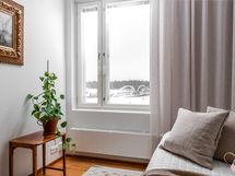 Keittiö ja olohuone muodostavat yhdessä tämän kodin sydämen, jossa on ihana viettää aikaa perheen ja ystävien kesken. Valo tulvii sisään isoista ikkunoista ja tilaa on juuri sopivasti. Luonnonvalo pääsee kauniisti luomaan avaraa tunnelmaa olohuoneeseen, sillä koti on sijoitettu kulmaan ja ikkunat avautuvat kahteen eri ilmansuuntaan.