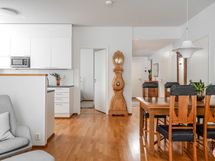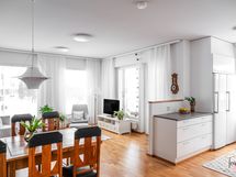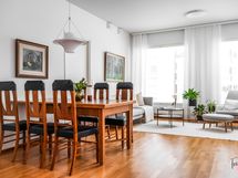Ruokailulle on myös oma tilansa, joka sijoittuu luonnollisesti keittiön ja olohuoneen väliin ja tänne mahtuu vaivatta suurempikin ruokapöytä perhe- tai ystäväpiirin yhteisiä hetkiä varten.