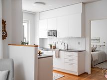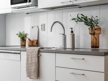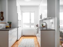 Keittiön valkoiset kaapistot on sijoitettu kahdelle seinälle ja puolikorkea seinä erottaa sen tyylikkäästi olohuoneesta pitäen tilan kuitenkin avarana. Keittiössä sijaitseva iso ikkuna on kerrassaan ihana ja näin kokkailujen lomassa voi ihailla avautuvaa maisemaa.