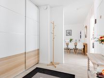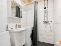 - Kylpyhuone, erillinen wc, suihku, suihkuseinä, allaskaappi allaskaappi puusepäntyötä, pesukoneliitäntä, lattialämmitys kph:ssa, kiinteät valaisimet.