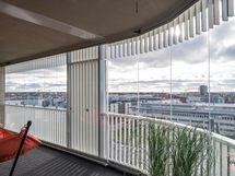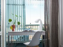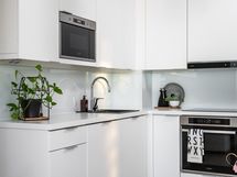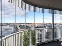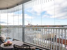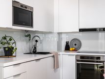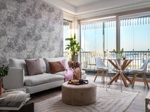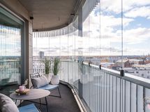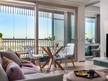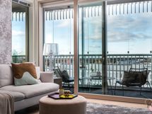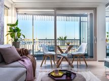 Keittiö on sijoitettu U-malliseksi omaksi tilakseen. Kodinkoneet on integroitu kalusteisiin ja valkoiset kaapistot ovat raikkaat ja aikaa kestävät. Ruokailulle on oma tilansa keittiön jatkeena olohuoneen yhteydessä. Tämän kodin olohuoneesta on upeat näkymät, joita katsellessa voi vain huokaista. Suuret lattiasta lähes kattoon olevat olohuoneen ikkunat liukuvat avaten käynnin valtavalle huoneistoa kiertävälle lasitetulle parvekkeelle, joka todellakin tuplaa asuintilat.