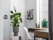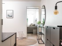 Jo sisään astuttaessa tämä koti hurmaa, sillä upea valo eteiskäytävälle pääsee suoraan eteisen jatkeena olevan makuuhuoneen ikkunan läpi. Eteiskäytävän varrella on loistavasti kaapistoja ja kaapistojen jatkeena matalampi istumataso, jossa on hyvä pukea ja riisuuntua.