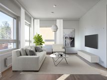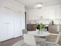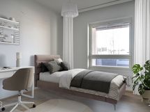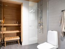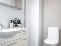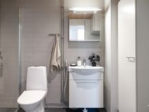 - Varustus: suihkuseinä, pesukoneliitäntä, lattialämmitys, wc-istuin, suihku, peilikaappi, kylpyhuonekaapisto.