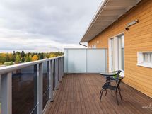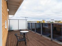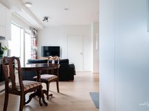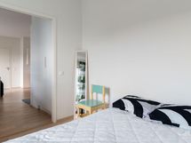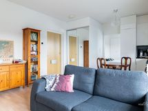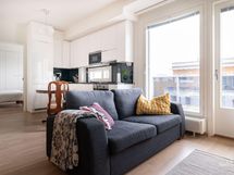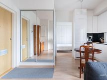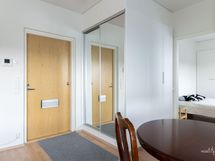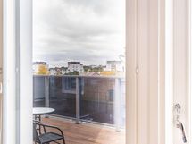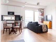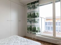 Asunnossa on hyvän kokoinen makuuhuone, jonka yhtä seinää peittää kaapit. Keittiö on avointa tilaa olohuoneen kanssa. Kaiken kruunaa iso parveke!