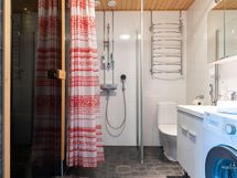 Varustus: suihkuseinä, pesukoneliitäntä, lattialämmitys, wc-istuin, suihku, peilikaappi, kiinteät valaisimet.