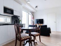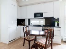 Liesi: induktio. Työtasot: kivi. Kylmäsäilytys: jääkaappi/pakastin. Varustus: liesituuletin, mikroaaltouuni, astianpesukone.