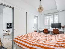 Huoneiston pohjaratkaisussa on neliöt otettu tehokkaasti käyttöön, ei hukkaneliöitä. Makuuhuone on varustettu kahdella liukuovella.