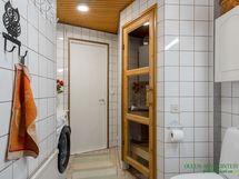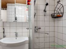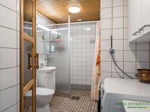 Varustus: suihkuseinä, pesukoneliitäntä, wc-istuin, suihku, peilikaappi, kiinteät valaisimet.