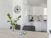 - Kodikkaan asunnon alakerrassa, heti sisäänkäynnin oikealla puolella, sijaitsee tyylikäs ja toimiva keittiö. Valkoiset kaapistot yhdistettynä mustiin vetimiin luovat modernin ja elegantin ilmeen, jossa kontrastit tuovat ripauksen särmää sisustukseen. Keittiö on varusteltu; jääkaappi/pakastin, astianpesukone, induktioliesi, erillisuuni sekä integroitu mikroaaltouuni. Keittiössä on hyvin kaappi ja laskutilaa. Ikkunasta tulviva luonnonvalo tekee keittiöstä viihtyisän ja valoisan paikan ruoanlaittoon ja arjen askareisiin.
