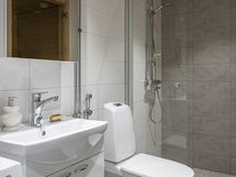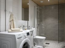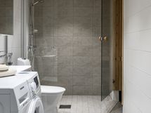 Varustus: suihkuseinä, pesukoneliitäntä, wc-istuin, suihku, peilikaappi.