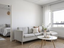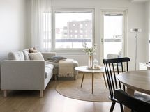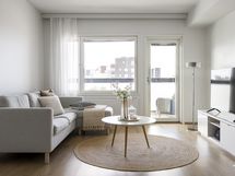 Nyt on vapautumassa seuraaville omistajille tilava saunallinen ja parvekkeellinen kaksio. Tämän 53 neliöisen 5. kerroksen kodin parhaita puolia on ehdottomasti sen pohjaratkaisu. Eteisestä löytyy liukuovikaapistot vaatteiden säilytykseen. Kylpyhuone on varusteltu pesukoneliitännällä sekä omalla saunalla. Olohuone ja keittiö muodostavat suuren ja valoisan tilan yhdessä viihtymiseen. Olohuoneesta on myös käynti lasitetulle parvekkeelle, jonne aurinko paistaa pitkälle iltaan asti. Vaaleat parkettilattiat ja maalatut seinät antavat hyvän pohjan oman tyyliseen sisustamiseen. Makuuhuoneen yhteydessä on vaatehuone.