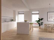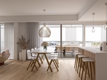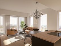 Tyylikäs ja valoisa 75 m2, 10. kerroksen kulmahuoneisto tarjoaa laadukasta asumista modernin kaupunkielämän ytimessä. Avara olohuone-keittiö yhdistelmä on suunniteltu yhdessäoloa varten. Suuret, lattiasta kattoon ulottuvat ikkunat tuovat runsaasti luonnonvaloa ja luovat tilaan ilmavan tunnelman. Huoneistokohtainen viilennys takaa miellyttävän lämpötilan ympäri vuoden. Asunnossa on kaksi makuuhuonetta: tilava päämakuuhuone tarjoaa rauhallisen lepopaikan, ja olohuoneen yhteydessä oleva lasiseinällä rajattu huone taipuu tarpeen mukaan makuuhuoneeksi, työtilaksi tai vaikkapa vierashuoneeksi. Arkea helpottaa erillinen kodinhoitohuone. Kulmahuoneisto ja olohuoneesta avautuva lasitettu parveke etelään suuntautuvilta näkymillä. Lisäksi makuuhuoneisto näkymät Otto Karhin puiston suuntaan. Koti, jossa yhdistyvät tyyli, toimivuus ja upeat näkymät.