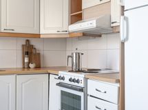 Liesi: sähköliesi. Työtasot: laminaatti. Kylmäsäilytys: jääkaappi/pakastin. Varustus: liesituuletin / suodatin.