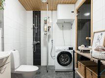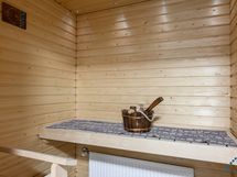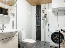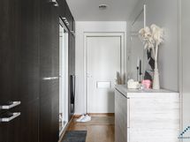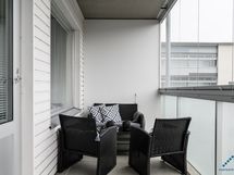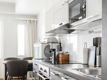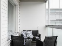 Huoneistossa laadukas ja korkeatasoinen kalustus; mm. keittiössä mustat työtasot, keraaminen liesitaso, integroidut jää/pakastinkaappi ja astianpesukone sekä mikro. Lattiat tammilautaparkettia, seinät valkoisella maalipinnalla. Tilava kaakeloitu kylpyhuone jossa varaus pyykinpesukoneelle ja omassa saunassa rentoudut juuri silloin kuin itse haluat ja isolla lasitetulla parvekkeella nautit olosta varhaisesta keväästä myöhälle syksyyn.