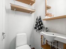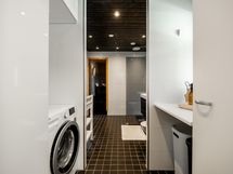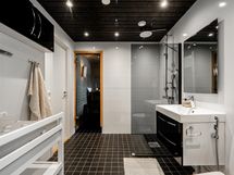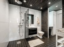- Kylpyhuone: wc-istuin, kaapistot, suihkuseinä, sadevesisuihku, vetolaatikosto altaalla, peili, lattialämmitys. Sauna: sähkösauna, saunassa on ikkuna. Kodinhoitohuone: kaapistot, pesukoneliitäntä, paikka pesutornille. Erillinen wc: wc-istuin, allas hanalla, peili valolla, hyllyt.