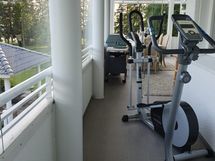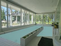 Valoisa uima-allasosasto meri- ja puutarhamaisemineen. Uima-altaassa (10,5 x 3,5 m) vastavirtakone.