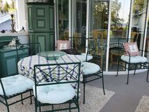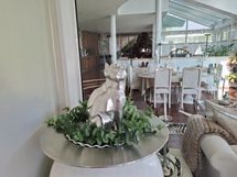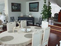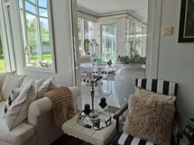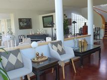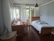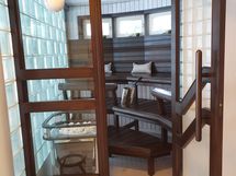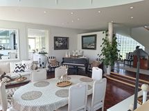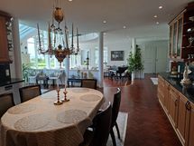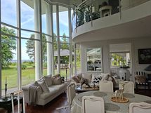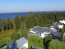 8 h +paljon avaria oleskelutiloja, sauna, sisäuima-alla, avokeittiö, kolme takkaa, kaksi terassia, 4 wc, 4 suihkua, + lisäksi erillinen rakennus missä toimisto/asunto, wc, suihku, kahden auton talli. Päärakennuksen kellarikerroksessa lounge maailma. Oma tontti. Merimaisema. Vain minuutin kävely rantaan.