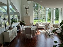 A personal, unique luxury home designed by architect Juha Paldanius, with many stylish architectural details. Sauna, indoor swimming pool, three fireplaces and private sunny plot. Many lovely, spacious living areas and four bedrooms + annex with 30 m2 apartment and garage for two cars. In main house the basement is big cozy lounge world. Open floor plan, kitchen and living room float beautifully and create a stylish area to enjoy. The whole house is unique! The home has a lot of timeless Art Deco spirit.