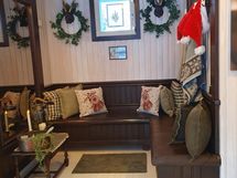 Kellarikerroksessa löytyy ihana, valtaisa oleskelumaailma takkoineen, isoine sohvineen ja viinikaappeineen, sekä viihtyisä kirjanurkkaus.