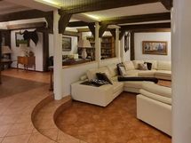 In the basement there is large lounge area, there is a lot of room for sofas, tables, large TV, wine cabinets, and cozy library corner + wire place.